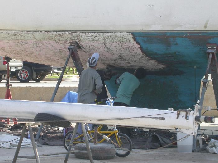 First up on the boat the mast came down. Then a tent was erected around the boat. Then just about every fitting on the deck came off. Most of them not without a fight as most had never been moved since installation around twenty years ago and many were sealed in with epoxy. The bottom paint was stripped off with paint stripper and then the epoxy layer was ground off. This took two weeks with two workers on angle grinders. One with a small grinder took the epoxy layer off and the other followed with a larger grinder and ‘faired off’ the fibreglass. Amazingly they produced a very smooth bare bottom. We could see a few wet spots but overall were please to find our bare bottom looking pretty healthy!