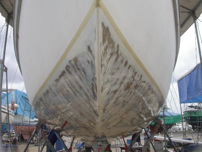 Over the next two months several areas started weeping around the ground out wet spots. These were chased out and five months laters we were satisfied all the problem areas were gone and the hull was dry enough to be sealed up again. They filled and faired the hull until it was very smooth and fair. Then on a near perfect day, a team of four worked their way around the hull applying and screening off the epoxy resin and went around the hull five times, moving fast enough to maintain a ‘wet edge’ all the time. So that’s the hull story.