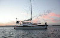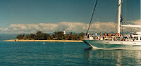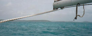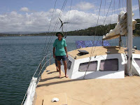 On the way back to the boat I noticed that Solace seemed to be out further then it was originally anchored. Once out at the boat I watched for a while and felt sure that it was drifting. A call on the radio raised no-one, although the dinghy was attached. I went back ashore to get Liz (who was lounging at the resort!) and we lifted our anchor and went out after it, now a long way out. As we approached the boat the two sleepy heads of David & Sonya come up and looked around in confusion.